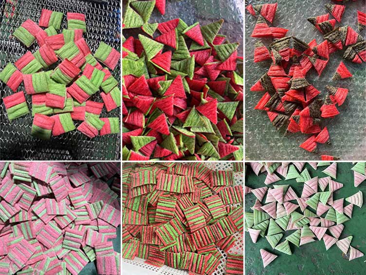 This is a fried snacks production line that was manufacturing colorful crispy 3 d snacks. The core machine is our new type food extruder that can make bicolor snacks. Usually the colou...